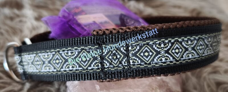 Borte ca 29mm breit, auf schwarzem Gurtband 30mm, Steckschließe 30mm, gefüttert mit weichem Leder in taubenblau, Gesamtbreite ca 33mm für Halsumfang 36 - 44cm - dieses Halsband gibt es auch in anderen Größen