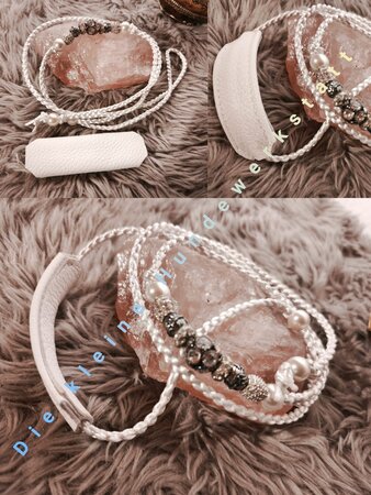 handgeflochten, Gesamtlänge inkl. Halsschlaufe ca 105cm, sehr schöne ziselierte silberfarbene Perlen mit Glitzereffekten, Kehlkopfschutz Nappaleder handgenäht ca 10cm x 3,2cm